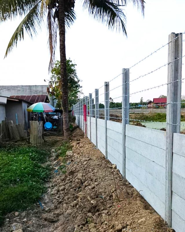 รั้วเสาไอ+ลวดหนาม มีลักษณะเป็นเสาคอนกรีต ขุดหลุม ตั้งเสา เทปูน ไม่ใช้เสาไม้ จึงมีความคงทน และอายุการใช้งานที่ยาวนาน